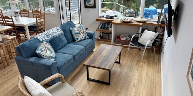 The living space opens to the back deck with lounging, a pretty outdoor dining area and a generous outdoor shower.