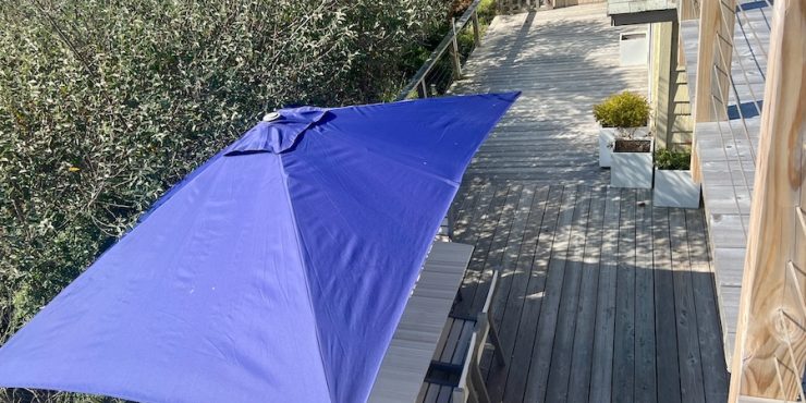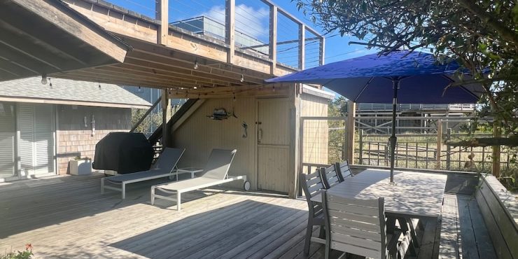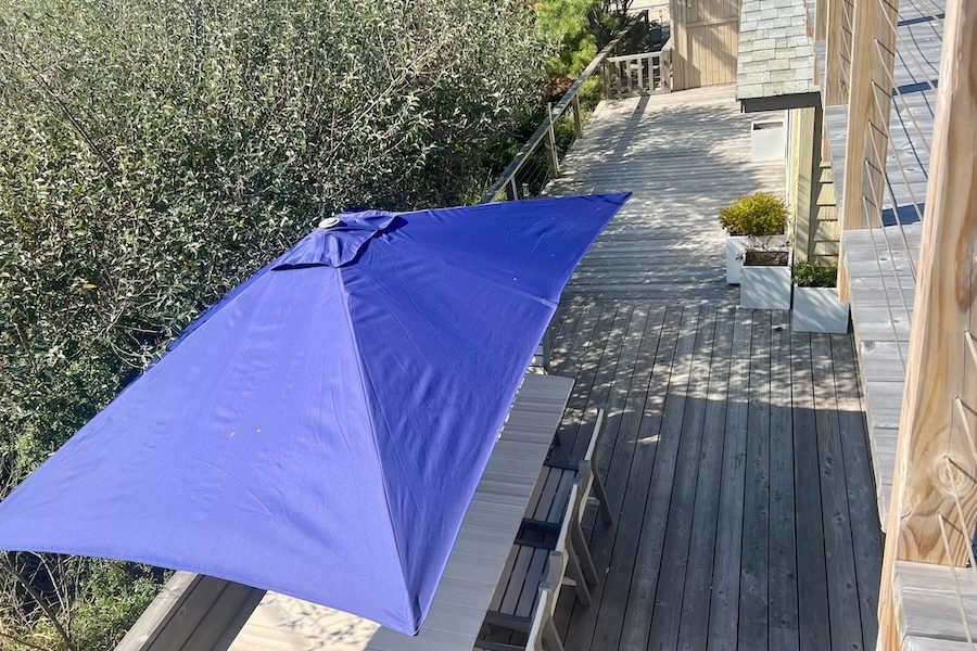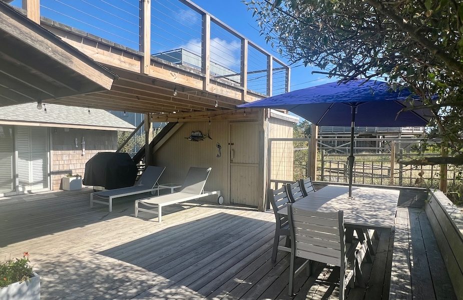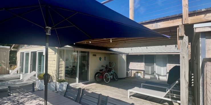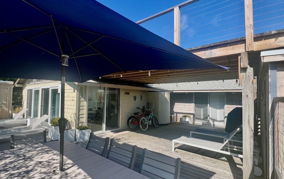 Knowing what is essential for a successful F.I. vacation, this house has it all.An outdoor shower, a gas grill, outdoor dining and lounging furniture, a wagon, beach bikes, beach chairs and beach umbrellas are provided. This deck has umbrellas and a shade structure, but also sunny lounging spots to bask in the rays.