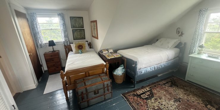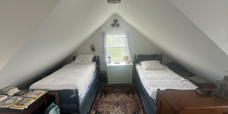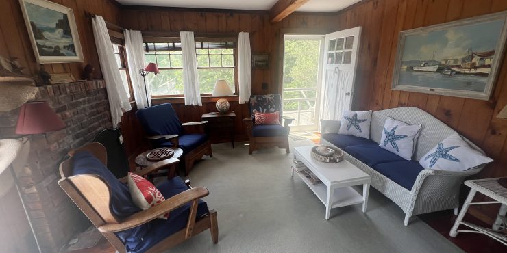 There are four bedrooms: one with a king bed, two with queen beds, and one with four twin beds. The home has an old Fire Island character throughout, with a comfortable, laid-back style.