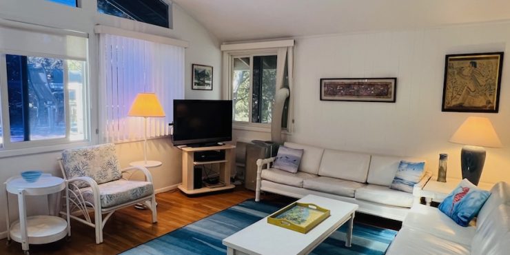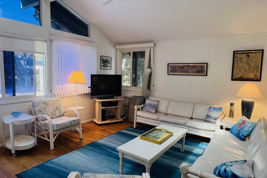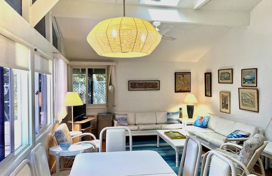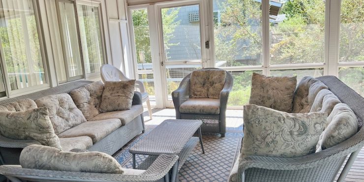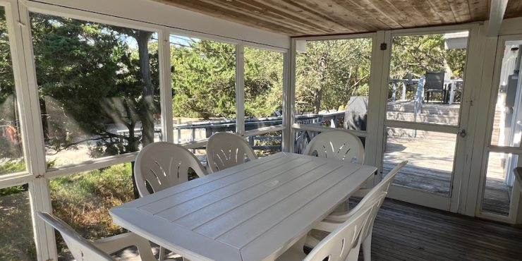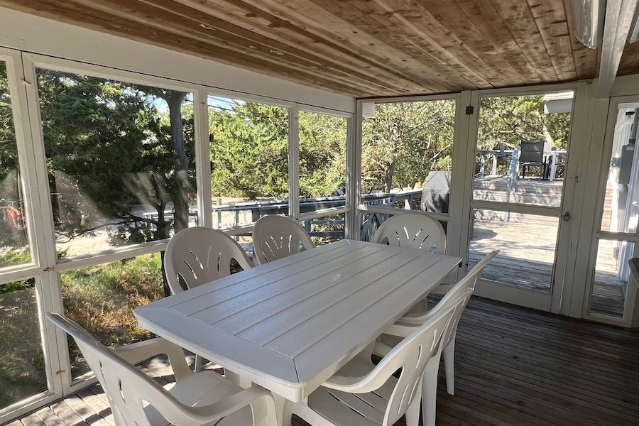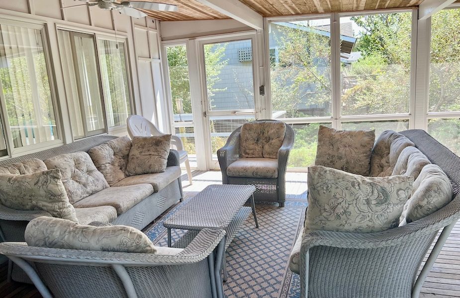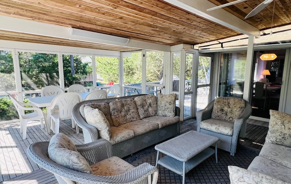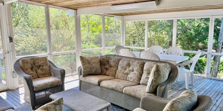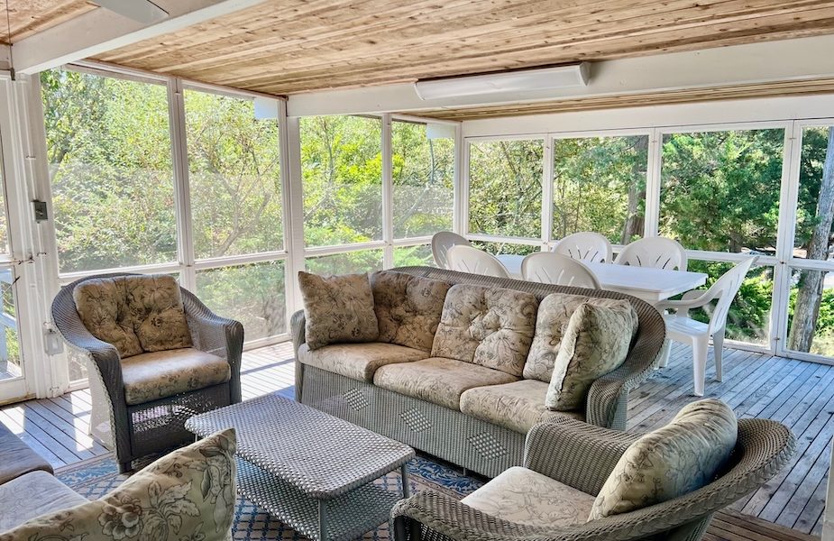 A screened-in porch extends the living space. Comfortable furnishings and a good sized dining table create a lovely shaded and protected space for lazy summer days and bug free evenings.
