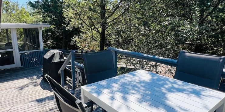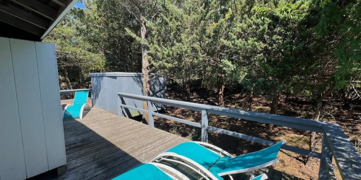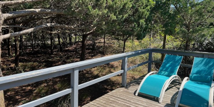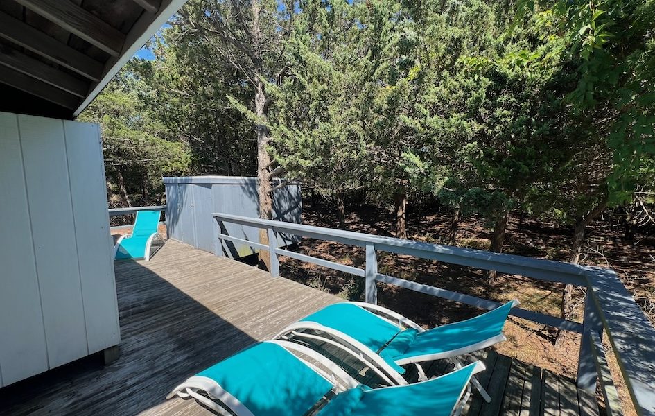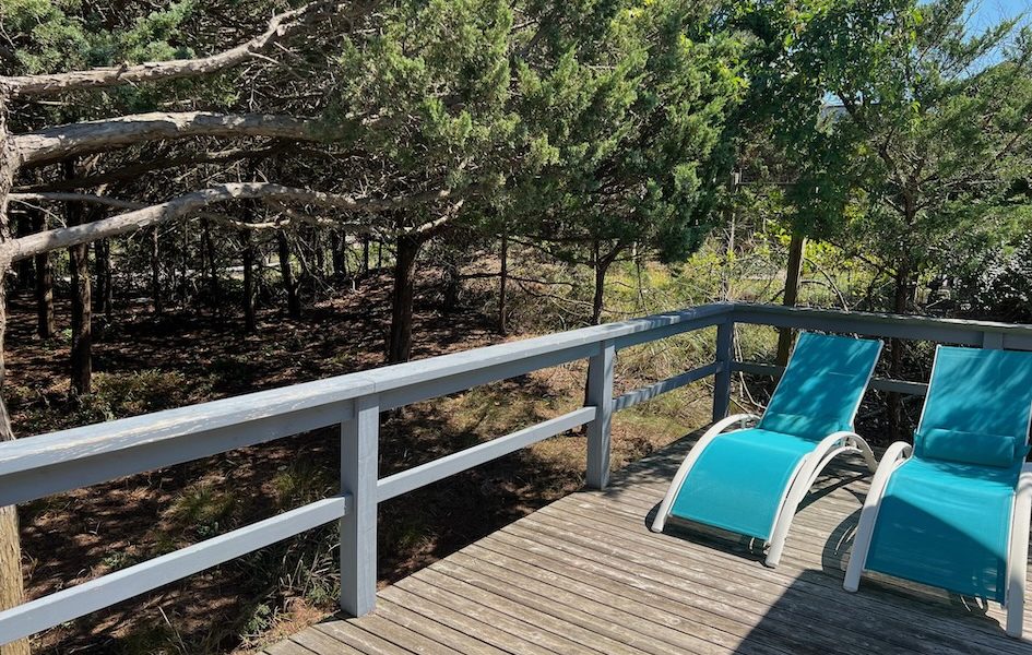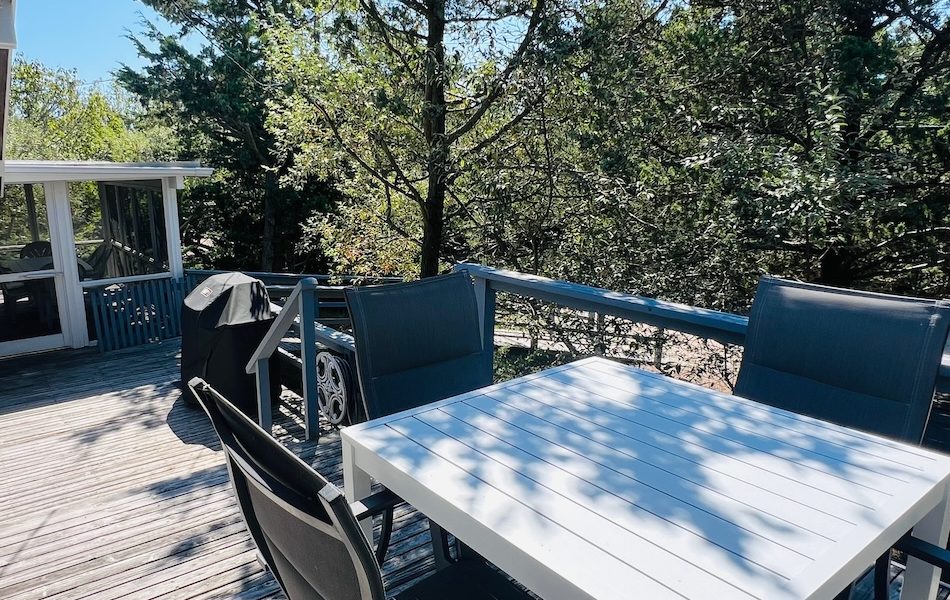 Mature trees provide a private, wooded setting for the back deck which has an outdoor shower and lounge chairs. A wrap around deck brings you back into the screened porch which also exits to the front porch and house.