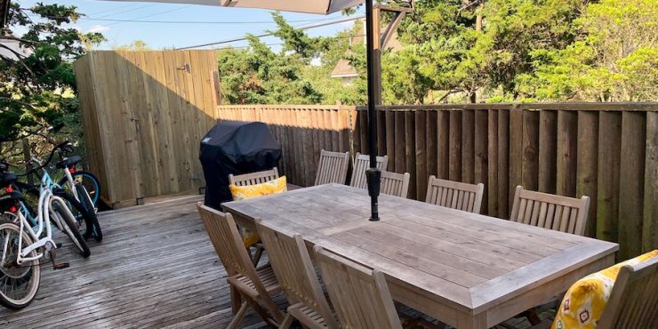 An outdoor shower, bikes, beach chairs, umbrellas, and oversized wagon are provided.